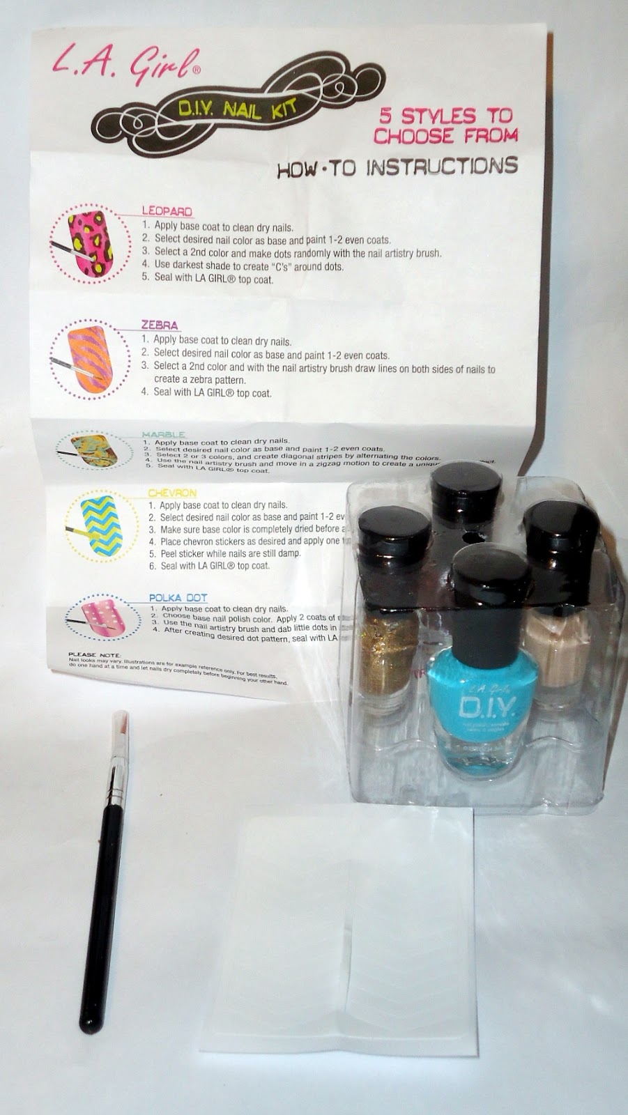 Hey everyone! Today I have a really cute L.A. Girl D.I.Y. Nail Kit to show you today! The kit contains 4 mini polishes, nail art brush, and nail stickers! On the packaging itself, it shows D.I.Y. Zebra, Marble, Chevron, and Leopard print ideas! And inside the box you will find your nail art brush, stickers, instructions which also have directions to do the Zebra, Marble, Chevron, Leopard, and Polka Dot art!